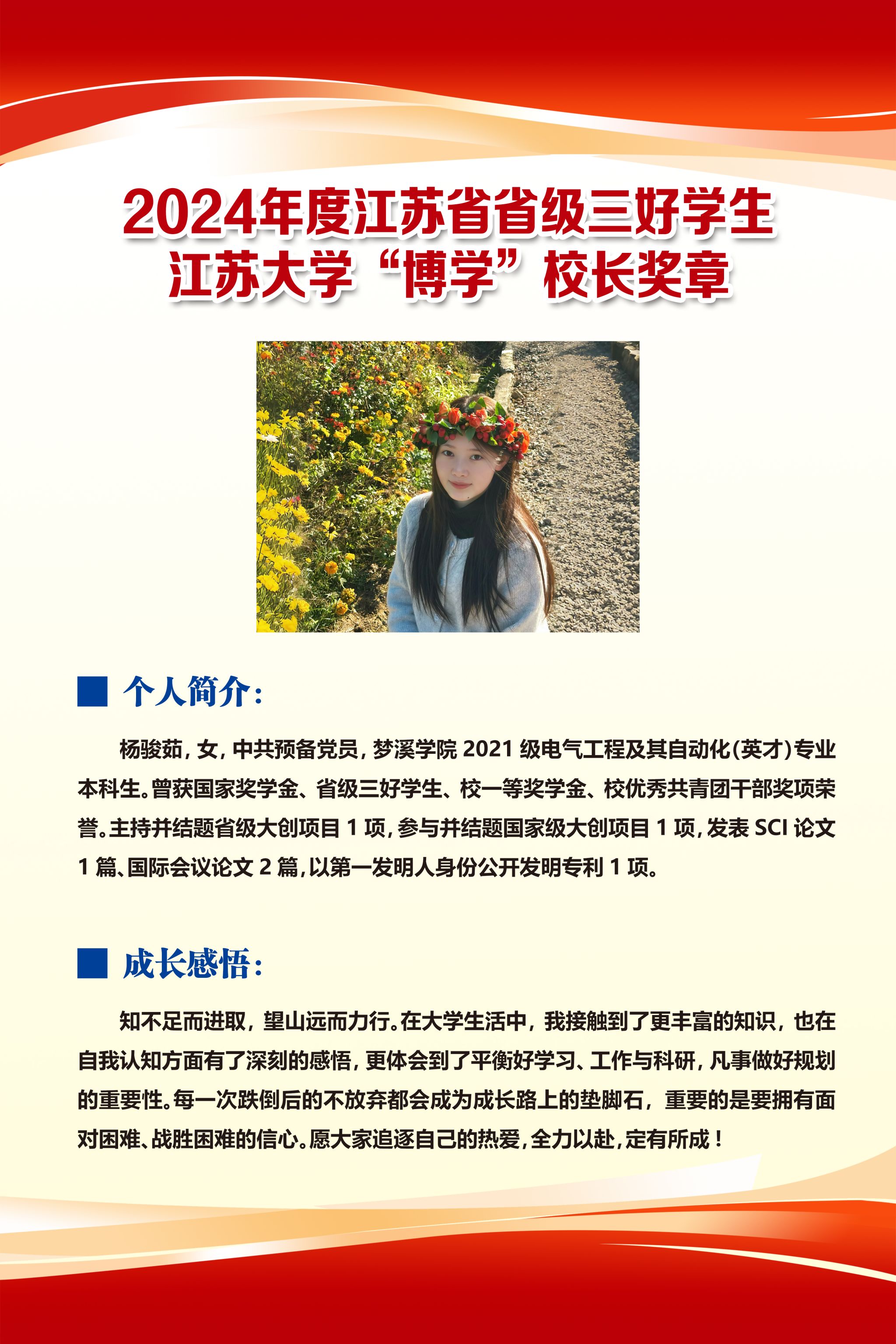 2024年度江苏省省级三好学生、电影天堂 “博学”校长奖章——杨骏茹
